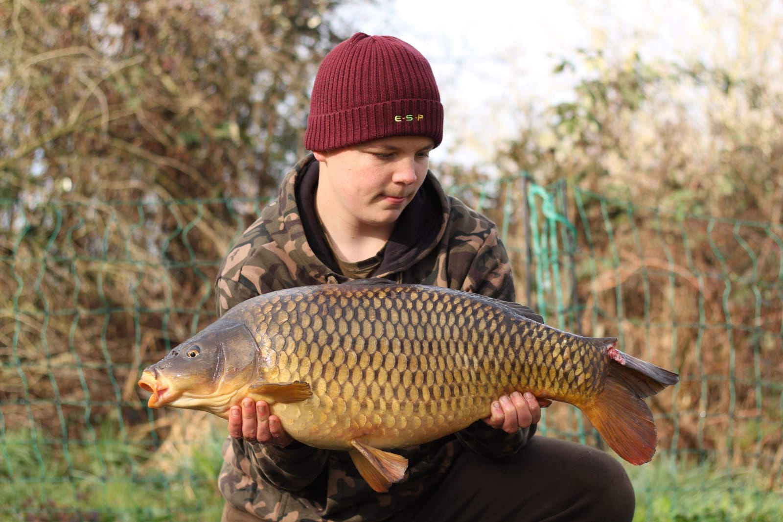I went out the following weekend, braving the harsh weather that was coming hoping to bag a few more fish. When I arrived at the lake all the swims were taken once agin with only the day swims available. Not to be deterred I covered my barrow with my bivvy and walked the lake. Luckily for me there was an angler in the swim I fished the previous week about to leave, I quickly collected my gear got set up ready to battle the elements. Northfield lake was getting hit by a 50mph wind which made casting that little bit more difficult, it took me about 30 minutes to get all the rods out on the spot where I felt they needed to be. Then began the game of spodding, needless to say this was a learning curve, after an hour of spodding I had put out about 2.5kg/3kg of bait. My first action on came around 1.30am, after which I continued to get liners for the next hour or so, the fish were on my bait yet again. The next thing I know its 6.30am, my left rod had it’s bobbin dropped back, as I reeled into the lead I found my lines had been tangled, one nil to the fish. I must admit it took me some time to get all three rods sorted and back out on their spots, far from ideal as it was ‘bite time’, at least casting was easier as the wind had backed off. I had been back in a little over an hour when in a flash the middle rod had two quick bleeps with the bobbin hitting the blank and a fish beginning to take line. The moment I connected with the fish I knew that this was a good fish due to the slow plodding then the short outbursts whilst peeling line, after a 20 minute battle the fish was in the net, I won! This was what fishing Northfield was about for me, it’s commons. This was far from it’s biggest but my first and one to remember, 20lb on the nose.