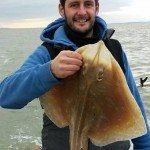 We had to wait a while for anything to happen with all of us on an all out assault for rays. John was the first to land anything which was a target fish, a reasonably sized small eyed ray. John was using a 4/0 hook with a Squid, sandeel and prawn cocktail as bait. I had become a little impatient by now so I decided to change to a 3 hook rig with smaller hooks and smaller baits to catch something, leaving myself the opportunity of catching a ray by using sections of sandeel on 2 of the hooks. Plagued by another one or two dogfish, eventually my rod pulled round after a slight taping bite and I was in to a ray! Finally, I had caught something other than a dogfish. It wasn’t the biggest but a small eyed ray.