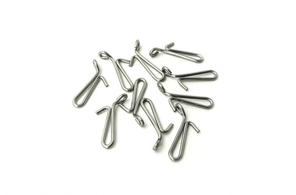 A Genie Rig Clip, bent so that it hangs parallel to the main line. Used as a pulley clip for a long snood, as a bait clip on a ‘clip up’ rig or as a secondary snood bait clip.